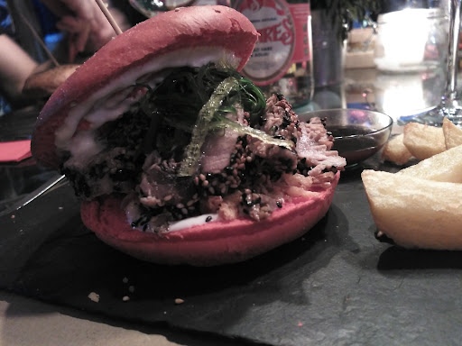 Read moreBuen emplazamiento, con terraza, buen comedor, prácticamente lleno, fuimos dos personas sin reserva y había mesas disponibles; pero, si es para un grupo llamado para reservar. Me gustó la decoración, sí que tiene un toque canalla y el comedor tranquilo para una buena charla. El servicio fue rápido, el trato personal fue cercano, educado y eficaz. Tomamos la ensalada de queso de cabra, contundente, para compartir, realmente rica, el rulo de cabra bien sellado, templadito, cubierto de la confitura de tomate y el resto de la ensalada con nueces, pasas, mezcla de lechugas, un poco de pimiento asado y vinagre de módena, 100% recomendable, probarla. También probamos dos hamburguesas, la granja y la bandida. La granuja es de pollo empanado, Bacon salsa César y la bandida es de tataki de atún, con pan de tomate... Excelentes ambas, con guarnición de patatas fritas con corte tipo gajo, contundentes. Es un buen lugar, la relación calidad precio creo que...