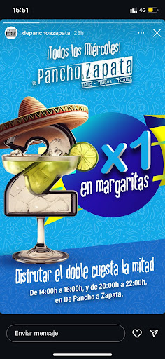 Al revisar la cuenta vemos 32€ en margaritas, y le digo amablemente a la camarera joven que hay 2x1 los miércoles, y me contesta: «No, hoy es festivo». Le enseño la historia en Instagram y digo: «Pues que lo especifique o no la subáis un miércoles festivo poniendo “Todos los miércoles”». Se ha ido a hablar con la responsable y ha vuelto diciendo que vale, que no nos las iba a cobrar, que nos quitaba 8€. Le decimos que son 16.
