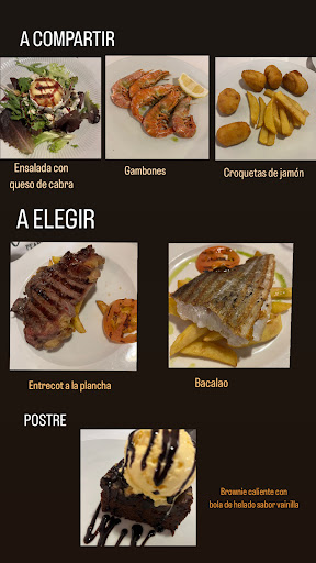 De entrantes para compartir nos sirvieron ensalada con queso de cabra, croquetas de jamón y gambones. Como plato principal había dos opciones: entrecot a la plancha o bacalao. De postre, brownie.