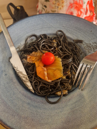 Black spaghetti is a completely different story. I don't know why you would serve something like this to anyone. Imagine yourself making good spaghetti and then throwing some mud on top of it and mixing it until your spaghetti loose all colours, all taste. Then you put salmon and one tomato on top and call it a dish. Jeeeez, WHY? Not only does it taste terrible, but it makes your face dirty all around your mouth, so you look like a clown.