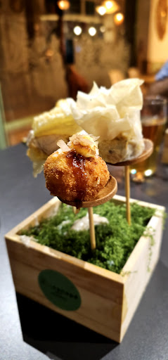 Presentation and Plating: The presentation of this tapa is both visually appealing and playful. The canapés are artfully arranged on skewers, creating a whimsical and eye-catching display. The wooden box adds a rustic touch, while the moss base adds a touch of nature. The attention to detail in the plating is evident in every aspect of this dish.