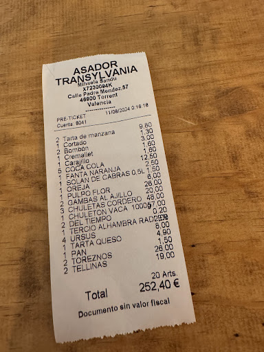 Read moreUna y no más. Entramos y tardaron como 15 minutos en atendernos. Éramos 7 y pedimos 2 menús “Transilvania” y la camarera nos dice que no es posible porque son para 4 personas mínimo, le decimos que es igual, que nos cobre 8 menús igualmente. Cuando pedimos los 3 entrantes y nos los empiezan a servir (otros 20 min después) nos dicen que uno no lo tienen, le decimos que nos lo cambien por otro. Terminados los entrantes, pasamos 25 minutos esperando y viene un camarero a tomarse nota de los postres a lo que le decimos que todavía faltaban las 2 parrilladas de principales, pasados otros 15 min sale una parrillada y le decimos que falta otra que tarde otros 15 min… empezamos a pensar que todo parecía una broma. Finalmente y pasadas 2 horas vienen a tomarnos nota de cafés y postre. Increíblemente pasan 30 min más esperando los postres a lo que reclamamos a la camarera que nos pide que le digamos que era para tomarse nota otra vez… el camarero que se había tomado nota, había acabado el turno y se había ido sin siquiera pasar la comanda. Después de casi 3 horas desde las 14.15 a las 17, conseguimos pagar en la barra para poder irnos. Sin duda Transilvania es lo más siniestro que he vivido. La comida no estaba mal pero la parrillada es una estafa, ahí no...