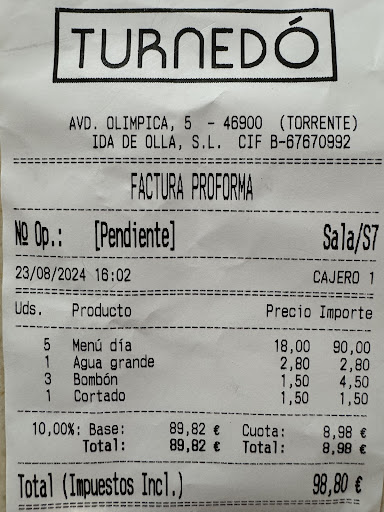 Read moreNo volveremos! Hemos ido 4 adultos y 2 niñas. El servicio es lento, cuando como mínimo había 5 personas trabajando. Las raciones nada lógicas para lo que cuestan. Hemos salido a 4 trozos de patata brava por persona adulta. El calamar de playa (18,50€) y era un calamar bebé. La atención de los chicos aceptable y amable pero la atención de la chica pésima, horrible y con malas caras. Y todo por querer llevarnos una botella de agua la cual habíamos pagado (2,80€) y estaba prácticamente entera. Hasta el punto de que al ir a cobrarnos lo primero que a preguntado a sido que dónde estaba la botella insinuando que nos la habíamos escondido para llevárnosla (la cual ya nos había informado y de malas formas que no nos podíamos llevar por ser de cristal y por que nos habían cobrado el contenido no la propia botella y para poder llevárnosla tendría que cobrarnos el cristal, en fin…) y al decirle que se la habíamos regalado a la mesa de al lado se a sentido ofendida, supongo que prefería tirarla, total como ya estaba pagada y no por ella. Horrible y nada recomendable. Hay muchos lugares más económicos y muy buenos. Y a Turnedó: haceros un favor y elegir bien...