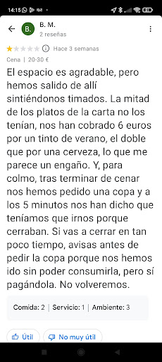 Llamamos antes de ir para preguntar si tienen el local climatizado, nos contestan que tienen aire acondicionado y además ventiladores. Llegamos después de recorrer varios kilómetros, el ambiente dentro estaba cargado y fue desagradable: no tienen aire acondicionado, el ventilador era chiquito para un restaurante. Nos dijeron que limpiarian la mesa pero la camarera pasaba y pasaba y ni caso. Mientras, miramos la carta y vimos que los precios eran desorbitados, como si se tratara de un restaurante peruano en condiciones. En fin, aún así esperamos, ya que habíamos hecho el desplazamiento. El señor de la barra salió y se fue a fumar su tabaco y nadie nos atendió. La música desagradable y alta. El local dentro tenía 29°. Una sola camarera para todo el local. No lo recomiendo para nada.