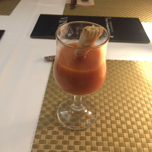 absolutely perfect steak! and the complimentary hot tomato soup was also very good, but... the place is overpriced and the chef experiments too much and doesnât care about the taste. we got prawns with salad side dish for âŹ12 - got 5 mid-size prawns with several salad leafs and lots of garlic sauce (definitely not enough for the price and the sauce was pointless; it easily kills the taste of prawns) and it was pretty salty. we took a grilled salmon with vegetables for âŹ16. not much fish, tiny slice of lemon and among that - chorizo! bright and brutal taste of chorizo doesnât match at all neither veggies nor salmon. and the most impressive thing was a huge bug, at least 4cm long traversing the dining room. our servant chased and tried to kill him. 3 stars because of the perfect steak. the rest was...