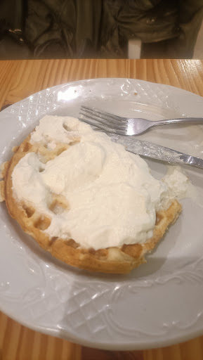 In terms of crepes I am not going to criticize. But if you order a waffle you will notice that it is like a doped crepe. Come on, the dough is the same for a waffle as for a crepe, the cream is not natural, it is from a jar, you dedicate yourself to the sweet and put cream from a jar, great. I hate that they want to trick me. I left it almost whole and went to another place near this one to eat a real waffle. Also, the service is not organized. They tell each other to go out to the terrace or to serve you inside. The cold will be the...