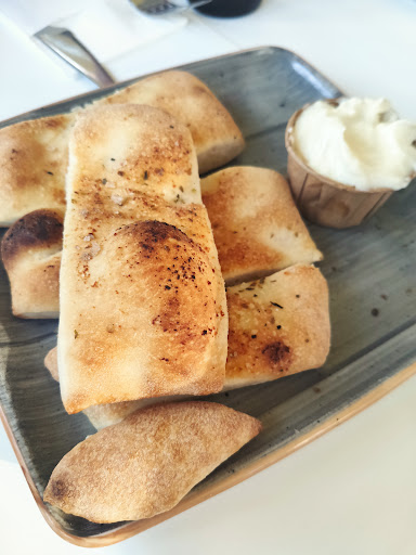 Was recommended by a friend to try this place and it sure wasn't a disappointment. Located on the main street facing towards the port, the place seems to stand out prominently due to its brown modern setting. Both indoor and outdoor seating are available and if you worry about the chilly breeze from the sea at night, they also have heater for the outdoor seating which automatically gets turned on at certain hours of the evening. The menu carries a wide variety of dough based menu from pizzas to pitas and hamburgers and are priced rather reasonably. We ordered the Pig'n Pollo signature pizza which in layman words is basically shawerma chicken shavings on fresh pizza base which was an exceptional delight for us. We generally love shawerma + pizza so when you have the combination of both, it was perfect! The hamburger patties are abit thinner than usual so you may want to order the triple stack if you have a big appetite. Calzone was rather generous in size, filled with loadsa of cheese. Our bill came up to an average of 15 euros per person and we had 2 beers each as well. It was definitely a good change of cuisine, not your ordinary cliche pizzas and thanks to the generosity of greens as well makes you feel less sinful for the indulgence. There was something about the dough that makes the carbs intake feels so worthy. Highly recommended to anyone who is looking for something different, will definitely be coming back...