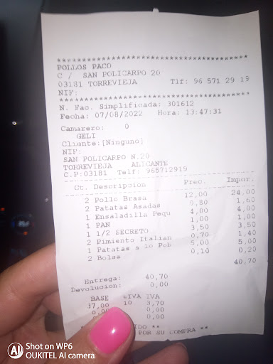 «Pollos Paco» es un negocio familiar con solera y a día de hoy dispone de tres locales en Torrevieja. Del que yo les hablaré es el que está enclavado en la calle San Policarpo número 20, que es el que yo conozco y al que he ido en varias ocasiones. El local se puede localizar desde lejos por el aroma que desprende en toda la calle y por el importante número de coches aparcados en doble fila a la altura de su puerta para recoger pedidos.