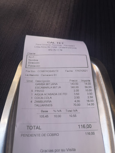 Nosotros solo fuimos a cenar al restaurante. Es una marisquería que vende su producto por gramos o unidades. La mayoría de marisco va a peso, eso quiere decir que tienes que tener claro que te vas a gastar bastante más dinero que en cualquier otro restaurante, porque el precio lo va a marcar el tipo de producto que pidas. (por ejemplo, una cigala tiene pinzas y puede elevarte mucho el peso y el precio, al igual que un centollo o buey de mar que es marisco pesado) En mi caso, un plato de 10 escamarlanes (cigalas) me costó 135 euros, ya que el precio era a 15e los 100g (es decir, 150 euros el kilo). Cuando ves eso en la pizarra intentas calcular cuánto va a costar el plato, pero es imposible porque no sabes cuánto pesa una cigala, ya que una puede pesar 25 g y otra 60 g. La verdad es que 135 euros para diez cigalas (nosotros dijimos que queríamos 10) es bastante excesivo comparando con precios de la zona de la costa brava, porque en cualquier otro sitio te comes un plato de escamarlans o escamarlanets por 20/30 euros y te vienen mas o menos las mismas unidades, además de que el producto también será fresco y bueno. No hace falta para nada gastarte 135 euros en ese plato, pero claro, yo no lo sabía porque no sabía calcular cuanto pesaban 10 cigalas. Lo mismo con la gamba roja, 15 euros los 100g. Suerte que pedimos solo 6 y eran pequeñas, sino me hubiera dado un infarto en la cuenta. No critico para nada la calidad del producto, porque todo lo que pedimos estaba buenísimo. De hecho, es lo más fresco que hay, porque los tienen vivos en peceras y tú puedes elegir exactamente cuál quieres comerte, tanto las piezas de pescado como las de marisco. La cogen de la pecera, la pesan y te lo cocinan. Había cosas que estaban bien de precio, por ejemplo, la cococha eran 6 euros la unidad, al igual que la zamburiña, y esto no es nada caro porque más o menos es lo que vale en toda la zona de la costa brava (comparando la oferta y demanda de esa zona, claro) Para ir una vez en la vida está bien porque todo está muy bueno, y si tienes dinero y no te importa en absoluto lo que te vayas a gastar, es el restaurante perfecto. Ahora bien, si no quieres gastarte un dineral, este no es tu restaurante. En la zona tienes, con el mismo tipo de producto y calidad, restaurantes bastante más baratos y asequibles. Aun así, destacar la calidad de su producto y el servicio que nos ofrecieron. Lo único que me gustaría comentarle al restaurante es que hay cosas que como camarero y dueño del local puedes recomendar, y yo hubiera recomendado no pedir escamarlans porque sabían perfectamente que diez escamarlanes serian 120/130 euros el plato, porque repito que tienen pinzas y pesan bastante. Como camarera le hubiera advertido al cliente de esto, y quizá le hubiera recomendado algo mucho más asequible oquizá un pescado, que quizá hubiera sido mas o menos lo mismo pero almenos te sacia. Otra cosa es que el cliente te diga me da igual, ponme las diez cigalas igual. Pero yo creo que son cosas que tenemos que avisar e intentar recomendar otras alternativas para hacer la experiencia mucho más amena. Que me cobren 135 euros por una lubina quizá no me hubiera parecido tan excesivo porque almenos te llenas, (aunque también encuentras buenos pescados por 30€), pero eran 10 cigalas, salí con hambre de alli porque eran 5 cigalas para cada uno. Un plato muy pobre, aunque de sabor sea increible, ese plato lo encuentras en millones de sitios con la misma calidad y por cinco veces menos. Y lo digo yo porque he ido a otros tantísimos restaurantes de la Costa Brava y he comido escamarlanes de película. Por lo demás, agusto, también con el servicio porque era familiar y muy majos, pero me fui con un sabor de boca bastante amargo. En la foto podeis ver el plato de 135 euros ( en realidad 153 € porque venían tambien las gambas, que me costaron 18) Cada uno que saque sus propias conclusiones.