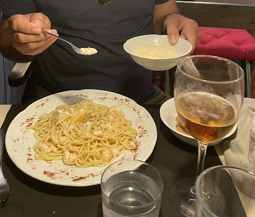 What a lovely find! A very small restaurant with homey touches and very happy staff-always a good sign. When we went in 3 out of 4 tables has the spaghetti with shrimp. A great understatement! We made it 4 out of 5 tables. Something that sounds so humble was a flavor explosion! It was creamy garlicky spaghetti with an egg yolk on top to mix in and some of the best shrimp we have had in Spain. Awesome! We started with the gazpacho and the vegetable tart, I had the veal with the lightest most complementary and not overpowering mustard sauce! Finishing with the true apple tart tatin was a joy! Someone in the kitchen really knows what they are doing and everyone is...