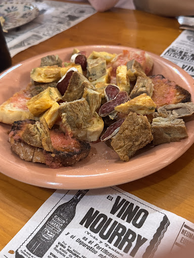 Si alguna vez te has preguntado qué pasaría si abrieras la nevera después de un apagón de tres días y decidieras servir su contenido sobre pan duro, este restaurante tiene la respuesta. El plato que nos sirvieron no es tanto una tapa como un atentado gastronómico. Una especie de “collage alimenticio” donde se encuentran, sin presentarse ni saludarse, trozos de tortilla pasada, salchichón cortado con desgana, pan con tomate que parece llevar horas en huelga de sabor, y algo que solo puedo describir como “cubos grises de carne con PTSD”.