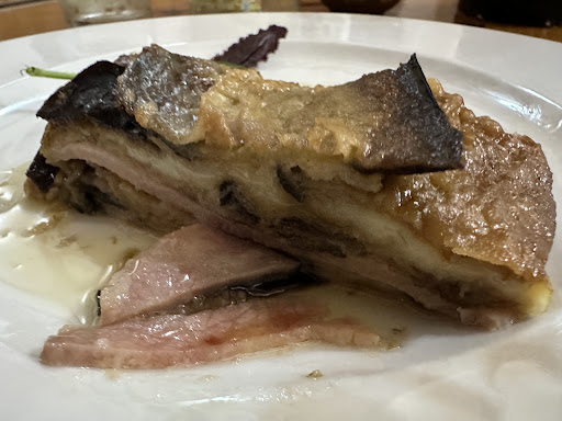 Er was geen menukaart, wat het juist extra leuk maakte: we lieten ons verrassen en dat pakte geweldig uit. Elke gang was creatief, met zorg bereid en verrassend lekker. We begonnen met een heerlijke carpaccio van zalm én een verrassend frisse variant met bakkeljauw. Daarna volgden huisgemaakte kroketten met drie vullingen: paddenstoelen, vlees en spinazie — allemaal even smaakvol. De cake van aubergine was origineel en perfect gekruid. En als afsluiter kregen we krokante auberginechips met honing: zo simpel en zó goed!