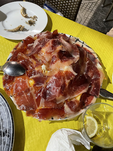 You ask for just drinks and out of nowhere they bring you some crisps and bread with frikadelle and onions then tomato and feta cheese ...you think yeah ok no worries it's Normal for Spain..start drinking your beer or sangria they bring out homemade soup tastes delicious nice and warm ....baring mind you only asked for drinks ...then we asked for just small portion of eggs chips and ham a traditional Spanish meal and it's comes out as a tower big massive mountain full of it ..... needed probably 4-5 people to finish .. customer service was great it's a busy restaurant but they find you a place to seat fast ... Waiters are fast and professional would recommend going as prices are very good for what you...