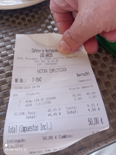 Read moreVisitando Trujillo nos encontramos de paso el restaurante Los Arcos preguntamos al señor que atendía en terraza si podíamos estar con la perra en terraza y nos dijo que si. La terraza está dando a la carretera pero con las lonas bajadas se estaba bastante bien resguardados del sol. El menú en un día de fiesta 16€. Los filetes los encontramos buenos. Últimamente los restaurantes están comiendo la moda de poner aceite de modena a todas las ensaladas y considero tendrían que preguntar antes por si no te gusta como es nuestro caso. Los rollitos de primavera por fuera estaban muy calientes y por dentro fríos. La calidad media , bueno para un meno no está mal del todo .Aunque podían mejorar calidades. Puedes elegir entre postres o cafés.Los camareros que nos atendieron muy correctos.Comimos tranquilamente y...