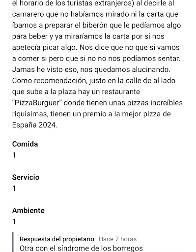 Me gustaría escribir una reseña en respuesta a una contestación fuera de lugar que recibimos de otra reseña. Estuve hace poco en este restaurante, y resumiendo me pareció todo penoso, la comida horripilante. Un familiar mío escribió al salir del restaurante una reseña, cito textualmente: "Comida muy cutre y escasa, simple". A lo que los propietarios contestaron: "Otra gaznapira (persona cutre) con el síndrome del borrego. Si tan cutre os a parecido todo, no os hubierais quedado a comer". Primero de todo, me gustaría recalcar la falta de profesionalidad del personal, cómo es posible que recibiendo un mal comentario, los propietarios respondan a la defensiva, y no contentos con ellos, insulten al cliente. Me parece que deberían aprender de las críticas y no pensar en que hacen todo perfecto. Esa es otra, la falta de educación por su parte, creo que está completamente fuera de lugar llamar gaznápira a las personas que pisan su local, cuando en ningún momento han recibido ninguna falta de respeto por nuestra parte. Me parece a mí que los únicos gaznápiros que hay aquí son ustedes, que primero, aprendan a escribir con buena ortografía, por ejemplo, el "ha" de "ha parecido" es con h. También recalcar que gaznápira lleva tilde, si es una palabra que usan a menudo (como he podido comprobar en otras respuestas de reseñas), apréndansela bien, más que nada para no hacer más ridículo del que hacen sirviendo la bazofia de comida. Por otro lugar, creo que nadie en mi familia tiene el síndrome del borrego, como ustedes dicen, si hemos escrito un mal comentario será por algo, y con más razón si el 80% de los clientes lo hacen también, aludiendo a las mismas carencias del restaurante, la comida, que es pésima, no me cansaré de repetirlo. Pero me alegra que vayan a la defensiva, lo único que consiguen es más gente en contra, mas reseñas negativas, y más infamación. Se están cargando el negocio ustedes solitos, y enhorabuena porque lo están consiguiendo. Resumiendo, creo que el lugar tan bonito que les rodea, como es la plaza de Trujillo, no se merece un bareto como este, tan lamentable y llevado por gente que no sabe ni escribir ni aceptar ninguna crítica. Además, veo que es muy común que insulten a los clientes en respuesta a las reseñas, no somos nuevos en ello. Pd.: disfruten los 10 céntimos que le...