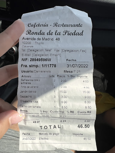 Lugar: cafetería Ronda de la Piedad (Trujillo - Cáceres) Mes/año de la reseña: octubre/2022 -ver nota 2- Día de la semana que estuvimos: Lunes, Laboral Horario: Cena Muy buen aparcamiento en la zona Regular accesibilidad para discapacitados Imagen del personal: uniforme del local Ubicación de la mesa que ocupamos: interior Ruido ambiente: conversaciones y televisión -ver nota 3- Suficiente iluminación del lugar que ocupamos -ver nota 3- Buena higiene del local en general Buena higiene del aseo en particular Visible la lista de precios No hay cartel con el aviso de disponibilidad de alérgenos Sí hay, la general, carta con alérgenos Mucha cantidad en la ración (para una persona): -ver nota 1- Precio medio por persona: 11,20€ Número de personas/platos/postres/bebidas -no pedimos botella de vino-: 2/2/2/3 Opinión personal: Buen lugar para comer. Comida casera y muy buena. Muy buena atención por parte de Raúl y Víctor. Recomendable.