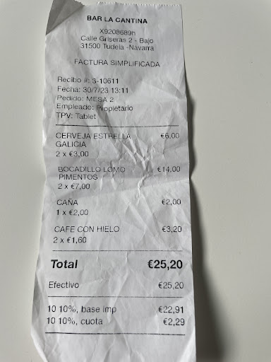 Read moreAunque vimos las excelentes referencias de los menús y precio, decidimos pedirnos unos bocadillos. Los bocadillos de lomo con pimientos muy buenos, la verdad pero tamaño normal. El precio nos pareció elevado, 7 € cada uno. La cerveza estrella Galícia, a 3€, también excesivo. En definitiva, adjunto el tiquet ya que nos pareció, por otras veces que hemos estado en Tudela, que estos no son los precios que habitualmente se cobran (a los autóctonos...
