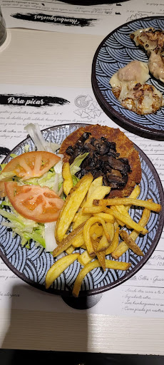 Read moreElegí este restaurante para ir ya que en su web vi que tenían una hamburguesa vegana. Este tipo de platos me facilita poder comer, ya que soy alérgica a la proteína láctea. Lo comente en el restaurante por si podía comer las patatas con 3 salsas, mi sorpresa fue cuando al traerme la hamburguesa me dijeron que no la podía comer porque el pan estaba hecho con mantequilla (por cierto, la hamburguesa vegana del restaurante era diferente a la de la web). El caso es que su solución fue ponerme la hamburguesa con los champiñones en un plato y unas patatas para "compensar" ya que no podía comerla como estaba puesto en su carta (adjunto foto). Mi indignación viene dada porque me parece un engaño que te lo pinten como algo vegano cuando no lo es. Las Gyozas estaban normales, tampoco destacables. Pagar 10,80 por una hamburguesa simplona me da mala gana. Es sólo mi experiencia, quizá la de otra persona sea totalmente opuesta. Pero salir a cenar y más en un fin de semana fuera de casa, y comértelo a disgusto no es plato de buen gusto (nunca...