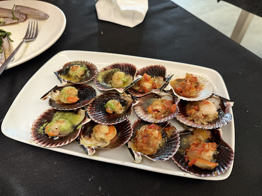 La chica portuguesa que nos ha atendido las dos veces que hemos ido este verano es encantadora y una gran profesional. La 1ª vez éramos solo 5 y estuvimos en la terraza de fuera. Pedimos: Zamburiñas verdaderas de la ría (no del pacífico como casi todas) que sabéis que son enanas y con una concha diferente, pulpo de la ría, ración enorme, pimientos de padrón magníficos y también gran ración, choquitos de la ría encebollados ¡buenísimos!; Mejillones, Caldo gallego no es el que me gusta con grelos, era con repollo; Merluza a la gallega muy buena, también chocos a la plancha. Es un sitio donde se come bien y los precios son asumibles. Pagamos cada uno 41€.
