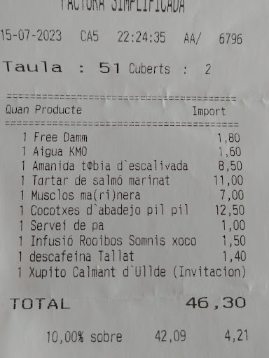 Read moreAcudimos para cenar, reservamos en la terraza, situada en una calle peatonal muy apacible. Tras servirnos un servicio de agua y una cerveza sin alcohol, empezamos la cena con una ensalada tibia, con queso de cabra gratinado, escalivada y confitura de tomate, la cual nos pareció muy buena y, aunque el camarero nos sacara aceite, sal y vinagre por si los echábamos en falta, la ensalada no necesitó más aliño. Seguimos con unos mejillones al vapor, también muy buenos, sin estar pasados y con un jugo muy sabroso del que seguimos disfrutando al acabar con los bivalvos. Continuamos con un tartar de salmón con aguacate, el cual estaba bien aliñado y, a nuestro parecer, los pedazos tanto del salmón como del aguacate eran algo bastos para considerarlo un tartar, cosa que no le quitó sabor. Terminamos los principales con unas cocochas al pilpil que eran mantequilla. Acabamos la cena con una infusión y un cortado. Les damos una valoración de 5 estrellas por el servicio, su interés en mejorar y porque los los platos fueron sabrosos y cumplidos. Fue toda una sorpresa conocer este sitio, si algún día volvemos a estar cerca, sin duda nos pasaremos a probar...