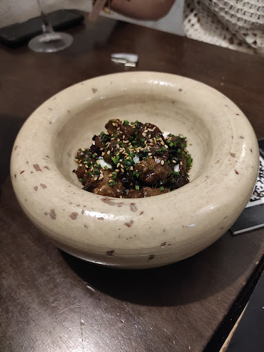 Bollito de atún y trufa con tomate, sésamo y albahaca: una delicia imprescindible. Atún marinado con un ligero toque de trufa en perfecta combinación. Como único pero, que es difícil de comer sin que se te caiga por los lados Croissant ahumado con cochifrito en adobo y hierbabuena: Igualmente espectacular. Presentado en una campana con el ahumado que se nota en el sabor y no es solo espectáculo, con un toque final de hierbabuena en contraste que es todo un acierto Dónut de Carrillá glaseado con queso de cabra y su jugo: La presentación es maravillosa. La textura y el sabor no son menos. Destacar ese contraste un poco dulce del exterior de dónut con el toque salado de la carrillá. Pese a encantarme, me sorprendió algo menos que los dos anteriores La NO croqueta. Para comer desde abajo y que los sabores se mexclen en un solo bocado Pavías de hueva de atún rojo de almadraba con emulsión de sus espinas. Otra gratísima sorpresa. Una pavía totalmente distinta y con una sabrosísima salsa en el fondo. Una maceta muy especial. fina crema de tiramisú con tierra de chocolate. La presentación es soberbia, el tiramisú también bastante bueno, aunque le falta ese sabor más intenso a café del tradicional y sin embargo destaca las virutas de chocolate que hacen de tierra en la parte superior.