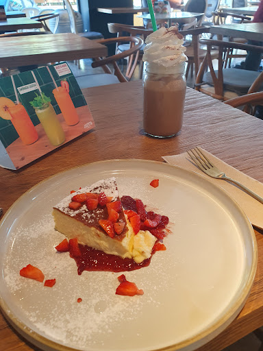 Ambiente agradable y local amplio. Tienen terraza, pero con el calor que hacía en la calle... como que preferí entrar dentro. Fui a comer porque lo descubrí el día anterior (nunca había estado por la zona) y me gustó el sitio, como que me apetecía ver qué había. Me decidí por 1 Italiano de pollo y una de sus bebidas (me encanta probar bebidas): Glam Guru, y de postre Cheesecake y 1 Di Mocca de café y Nutella. Para mí fue más que suficiente, pero si eres de mucho comer seguramente deberías pedir algo más. De lo que pedí, lo que menos me gustó (y esto no quiere decir que no me gustase, sino que lo demás se adecua mejor a mis preferencias) fue el café que pedí. Está bueno, al ser frío apetece cuando hace calor... pero después de haber comido todo lo demás, me resultó pesado; posiblemente con el estómago vacío no lo hubiera encontrado así. Desde mi punto de vista, el punto fuerte de este sitio son los zumos. Me encantó el Glam Guru que pedí y ya había probado otro (cuyo nombre no recuerdo) que fue lo que me hizo pedir esto en lugar del típico refresco. Otro aspecto a tener en cuenta es que si tienes intención de trabajar con el ordenador mientras estás allí o necesitas cargar tu teléfono, los únicos enchufes disponibles están bajo una mesa alta... el cable del cargador del ordenador llegará a la mesa baja más cercana, pero si tienes un cable algo corto para el teléfono posiblemente no. Aunque es un sitio al que volveré, no creo que sea del tipo que puedan permitirse todos los bolsillos visitar todos los días; pero sí de...