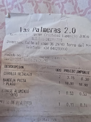 Las empanadas igual jajajjaa cuando las pide te meten iva, impuestos de la harina.. Rollos patatero jajajjajajajajajjas vaya forma de hurtar y si no es asi actualicen la carta con su precios correspondientes.. y avisar sobre el iva que en ningún restaurante lo cobra.. solo vosotros en ese cuchitril de mala muerte.. la factura la encontre en mi bolso de maquillage jajja pero mentirosa no soy .. y quien se sienta timado que venga y lo hable...