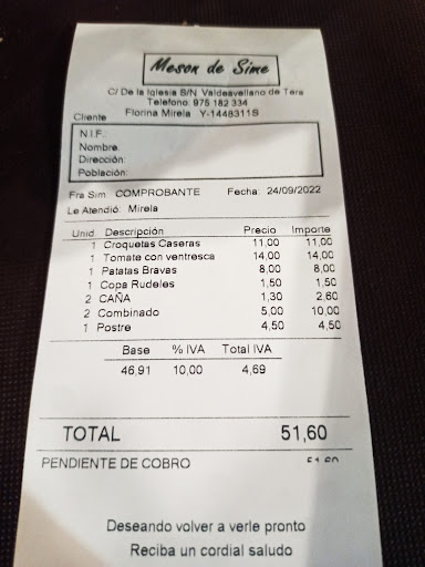 Ayer estábamos haciendo ruta por las tierras altas de Soria y decidimos buscar un lugar donde poder comer temprano, estos días atrás no ha habido manera que nos dieran de comer en condiciones en ningún sitio en los que hemos parado. Llamamos al Mesón de Sime y reservamos para las 14h. El lugar es pequeño pero acogedor. Nuestra mesa nos estava esperando. Enseguida nos tomaron nota y nos trajeron los primeros. Quisimos probar un vino fuera del menú y no nos pusieron ningún problema. Los segundos tardaron bastante en llegar, pero Mirela, la camarera/cocinera nos pidió mil disculpas. Y al ver mi segundo me dijo que iba a morir de hambre con lo que había pedido (soy vegetariana y no habían muchas opciones para mí) me preguntó mis gustos y al poco se presentó con una super ensalada de pimientos asados (el ajoblanco también estaba espectacular). Después de los cambios que pedimos, más mi ensalada extra, los postres y los cafés llegó la hora de pagar 😱. Tres personas 39€ en total? Me levanté y le comenté a Mirela que se habían dejado de cobrar el vino, mi ensalada y los cafés. Y me dijo que no había habido ninguna equivocación, que la bebida, el café y los postres entran en el precio del menú y que mi ensalada había sido un detalle que había tenido, que si volvía, que se lo comentará al camarero lo de mi dieta vegetariana que ella ya inventaría algo que darme de comer. Y de regalo me llevé unas bonitas palabras de ella. No sé si volveré a hacer ruta por las tierras altas de Soria, pero de lo que si estoy segura, es que si vuelvo iré al Mesón de Sime, por cómo nos trataron. Ah y no os dejéis perder la visita al pueblo, súper chulo y con un montón...