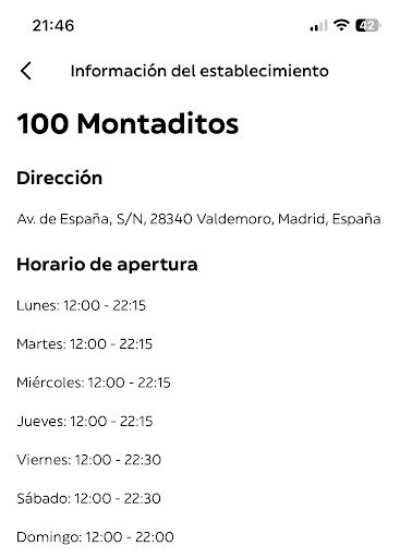 Read moreFui a disfrutar de lo que debía de ser una agradable velada en este establecimiento, el 100 montaditos de valdemoro, cuando me tope con un comportamiento de lo más desagradable por parte del personal de caja, en concreto una mujer de nombre AGUS que me atendió de manera deplorable. El tono que empleó hacia mi persona y mis amistades dejó mucho que desear incluyendo faltas de respeto por parte del personal, concretamente, de la mujer mencionada anteriormente. Los sucesos acontecidos fueron los siguientes: Mientras una de mis amistades realizaba su pedido (mientras las demás nos manteníamos en la cola para realizar pedidos individuales), la trabajadora encargada de las bebidas preguntó que bebidas queríamos tomar a todo el grupo a la vez, pero dada nuestra situación de espera en la cola y el alto murmullo no pudimos oír su pregunta, como respuesta a esto, la cajera, Agus, le dijo a su compañera "estas estan sordas eh", estas fueron sus palabras textuales, lo cual considero muy desagradable por su parte y de muy mal gusto. Me parece una falta de respeto y de educación tanto a mi persona como a la comunidad con dificultades auditivas. Este suceso ocurrido el 19/09/25 a las 20:54 me parece totalmente innecesario y dejo un mal sabor de boca a todo nuestro grupo, el cual se encontraba celebrando el aniversario de una de nosotras. Gracias a dios, los dependientes que sirvieron la comida fueron muy agradables y nos desearon un buen provecho. Pongo esta resera porque espero que nadie más tenga que pasar por esto. Saludos cordiales, espero con ansía una...