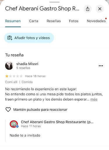 Señor Aberani, tómese esa reseña como una crítica constructiva e intente mejorar todas estas cuestiones si quiere que su clientela vuelva. En nuestro caso, sintiéndolo mucho,...