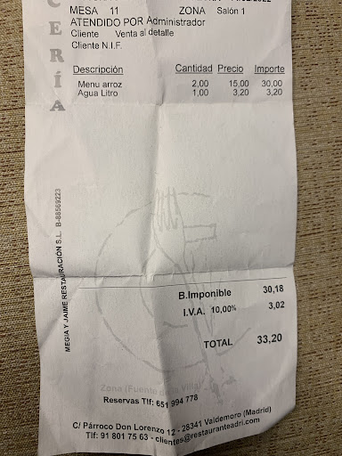 Read moreAcudí con mi señora a comer el menú entre semana (12,50€), creo recordar, de vez en cuando vamos ya que para ser un menú de diario no es económico, normalmente pedimos el menú de arroz y para beber, siempre tomamos vino con casera y agua. Esta vez al sentarnos y ver la carta observamos que el menú había subido a 15€ por persona, estuvimos a punto de levantarnos ya que ese menú en día de diario y por ese precio resulta bastante caro, pero por educación nos quedamos. Pedimos la cuenta y nuestra sorpresa al traernos la cuenta nos habían cobrado 3,20€ por la botella de agua, le pedimos explicaciones de por qué nos cobraban el agua, salió el dueño y nos dijo “de muy malas formas” que él era el dueño, que habíamos bebido más de una copa de vino, que ponen la botella entera pero que si te sirves más de una copa te cobran una de las bebidas y que nos cobraban la botella de agua. El trato durante el servicio regular, el tiempo de espera largo y la educación del propietario intacta ya que...