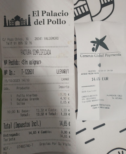 Por cierto hasta el 30 septiembre mi pedido que siempre era lo mismo ( 1 pollo asado y 1 patatas fritas grande ) su precio era 14,20€ ... Hoy 15 octubre fue de 14,65 €. En resumen cada vez todas las cantidades más pequeñas y los precios más grandes.