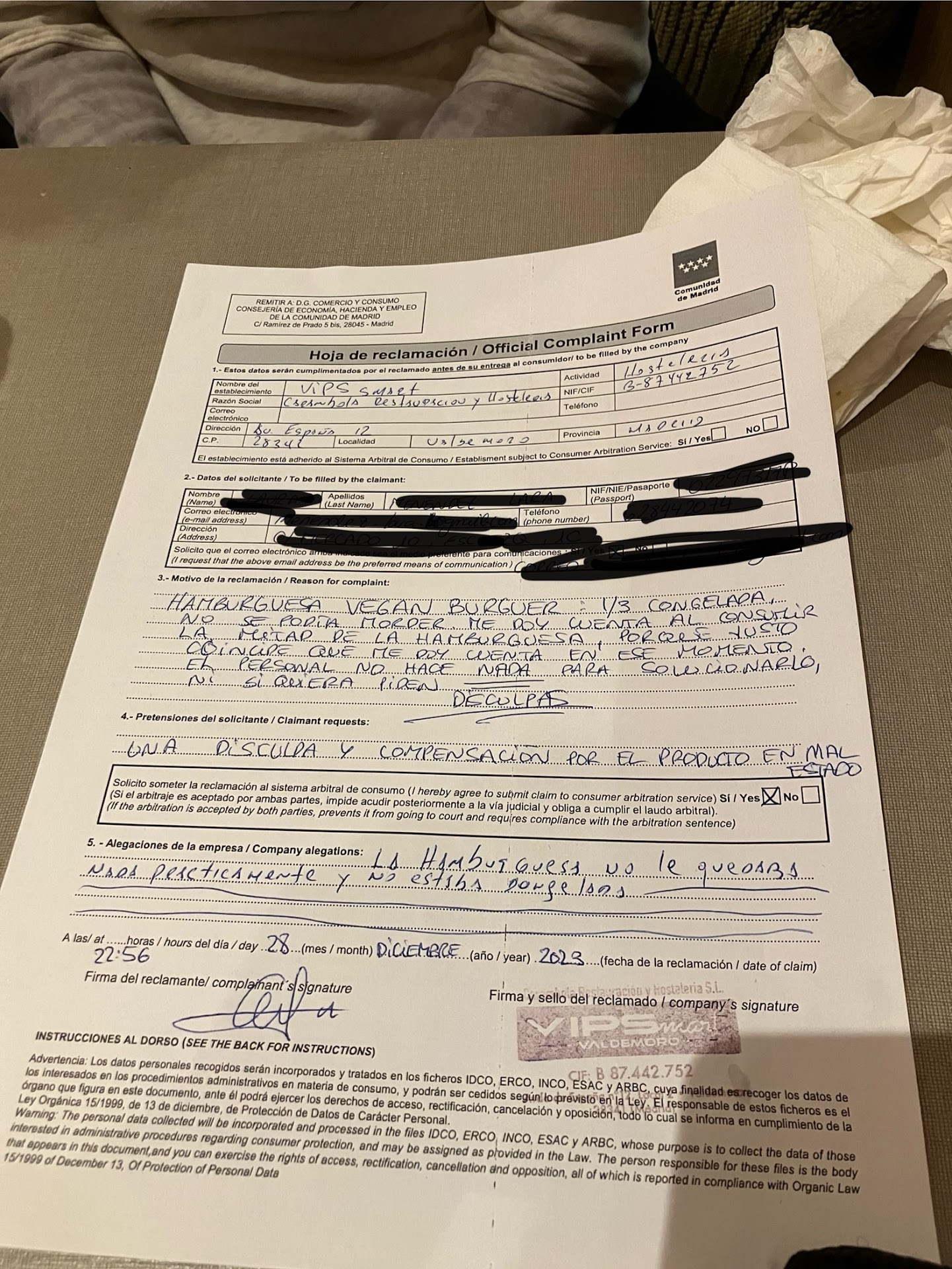Luego, recibimos el pedido erróneo, no nos dan el sándwich que habíamos cambiado por su equivocación. Y para colmo, pedimos los dos sándwiches nuevos, que en su propia cartelera y publicidad vienen con salsa y nos dicen que no que no llevan salsa. Después de insistir nos dicen que es que para pedidos para llevar no se pone la salsa en un tarrito, pero para sorpresa resulta que el cachopower y la hamburguesa que pedimos si. Por tanto, pedimos una explicación de por qué una cosa si y la otra no y nos ignoran. Por eso decidimos pedir una hoja de reclamaciones (se niegan a darla), después de mucho insistir sacan una hoja que no es una hoja de reclamaciones al uso.