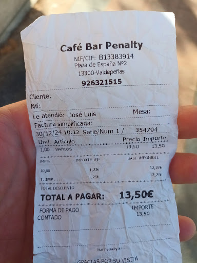 Read moreHoy día martes 28 de marzo hemos ido a comer al café bar penalty y hemos pedido el menú del día de 14€ por persona, lo primero en destacar la atención ha sido buena pero luego ya ha venido lo malo yo me he pedido filete de ternera y revuelto de la casa , el filete de ternera no estaba jugoso , no era de calidad no estaba bueno además lo he vomitado porque no me ha sentado nada bien, el revuelto de la casa tampoco estaba muy bueno, tenía mucho aceite y muy pequeña la cantidad vamos que me he quedado con hambre y a mi compañero ha pedido una sopa de picadillo y eso parecía agua solamente un cacho de pan quemado parecía que estaba flotando las cosas tampoco estaba muy buena y luego se ha pedido mi compañero patatas con croquetas de caseras no tienen nada de caseras porque sabía mucho a industrial y mucho aceite , de verdad es un robo porque pagas 14€ y no es de calidad nada no se que ha pasado ahí pero no voy a ir más a comer slli , pero solamente me tomaré un aquarius y nada más , todo fatal, luego he ido a los cuartos de baños y había meado en el suelo que parecía aquello que ibas andando entre meados un desastre vamos luego papeles tirados por el suelo y un papel pegado en la taza con pis ,porque no he hecho foto y me arrepiento no haber hecho fotos para enseñaros el servicio más malo que ha habido , vamos el servicio ha sido decepcionante en mi opinión y la opinión de...