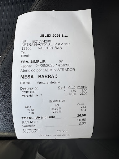 La comida estaba buena (en mi caso salmorejo de primero y pollo asado de segundo) y la atención no fue mala tampoco, el espacio antiguo (pero algo que te esperas de un restaurante de paso y de menú del día, algo que no molesta) todo apuntaba a un buen bar de carretera en el que poder parar a comer un menú del día que esperas que te cueste 15/17€ pero cuando te traen la cuenta y es de 26,50€…. Es una barbaridad… por ese precio desde luego que no recomiendo para nada que alguien que está de paso paré a comer, hay restaurantes iguales y mucho más baratos…