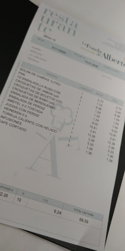 Cocina, pues ,por desgracia, no está a la altura de la carta. Está bien pero sólo de notable. El pan riquísimo, caliente,parecía recién hecho De lo q pedimos: 📷 ensaladilla rusa, media ración, muy insulsa, tuvimos q pedir sal. No estaba mala pero buena tp ,una pena pq es uno de nuestros platos "prueba" 6/10 📷 croquetas, de jamón, de rabo de toro y de boletus , muy ricas . Grandes, se pueden pedir por unidad y con media de cada vas servido. No sabría decir cuál ha sido mi favorita. 9/10 📷ensalada de berenjena de Almagro, piquillo,ventresca,queso manchego,cebolleta y anacardos tiempo q una ensalada no me sorprendía y esta lo ha hecho. 9/10 📷 ensalada de perdiz, muy floja, en comparación de otras, ni el escabeche era muy allá ni el acompañamiento 6/10 📷 pochas con perdiz, normalitas 7/10 📷 torrija con helado, rica 8/10 Nota media 7,5/10 . servicio, camareras agradables,protocolo covid ok. Buen ritmo y sincronización en platos. 8/10