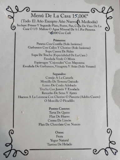 Read moreSomos de León! Fuimos el día jueves a comer después de visitar las cuevas de Valporquero. En la terraza se estaba bien, una ubicación perfecta para el buen día que hacía, hasta ahí todo bien, lo malo fue ya cuando nos decidimos a comer (dos menús del día/16,50€ cada uno). Para empezar pedimos agua para comer y nos mete agua de grifo por toda la cara, la comida no era del día y, teniendo en cuenta que cierra L/M/M, lo recalentado en microondas era de la semana anterior, los garbanzos aceptables, pero el conejo, frío de nevera (creo que se les olvidó calentarlo). El señor (creo que el dueño), por él no nos ponía ni el pan, falta de atención por su parte, lentitud y dejadez. Le pedimos un poco más de pan y creo que se hizo el despistado, me acerqué yo hasta la barra para ir a pedirlo por segunda vez y de paso también pedir que me calentaran la comida de lo fría que iba. A la hora de pedir la cuenta, iba en un papel escrito a boli en una hoja de comanda, que no se entendía ni lo que nos cobraba, en fin.... Eso ya para que le llegue una inspección de hacienda. En conclusión: De nada sirve tener un lugar privilegiado, si luego el servicio y la comida deja mucho que desear....
