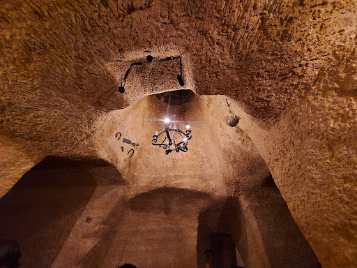 We stayed here while attending a family wedding at nearby Bercianos. The restaurant/hotel is unique in that the rooms are located in a modern façade behind which are the caves which comprise the pub and restaurant. The room was fine and could only have been improved by providing things like toiletries, hairdryer etc., but was modern, clean and tidy. We did have a problem in that we don't speak much Spanish and the staff spoke no English but we managed and they were friendly and welcoming. There is ample parking and gardens to the front with chairs and tables to sit and enjoy the sun (or shade if you prefer) The food in the restaurant is very good and reasonably priced. We had an inclusive breakfast (cake, coffee, orange juice) and the wedding reception was held here. Late at night we would have a drink in the cave bar before bed. As we were here over a weekend we were able to witness how busy it was. Should we ever return here we would stay again and to anyone passing through the area I would recommend it but remember your toiletries...