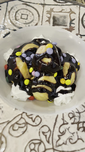 Los postres deben de mejorar. Todas coincidimos que lo cargan mucho de lacasitos, virutas de regaliz negro y siropes innecesarios porque enmascara todo el sabor del postre. Como sugerencia a un restaurante de calidad con muy buen producto, debería aparecer en la carta si los postres están acompañados de siropes u otro para que el cliente decida si lo quiere o no. Pedimos: Profiteroles de nata con sirope de chocolate Panacota con sabor a mango muy rico pero para nosotras el sirope de caramelo sobraba. Cheescake buena pero el acompañamiento de regaliz no. Aunque apartaras las virutas de regaliz ya se había quedado impregnada en la tarta.