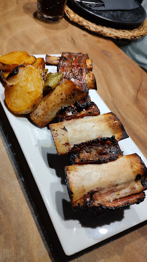 We went to eat here and ordered about 1.5 kg of ribs, which were supposed to be shared between 3 adults and a 12-year-old child. Here's what we received (see photo) for 77 euros!! I’ve been a chef for 18 years, and I’ve never felt so ripped off in terms of price. Moreover, this cut of meat is a lower-quality piece, not a ribeye or filet, which are much more premium and therefore more expensive. I’m not questioning the quality, as it was very good, but when a table requests a piece of meat for 4 people, make sure to serve enough side dishes for everyone. Potatoes aren’t expensive... neither are peppers... and a small sauce with a piece of bread doesn’t seem like too much to ask for 77 euros!!! 1.5 kg raw, minus the 15 to 20% loss during cooking, minus the bones and fat, there’s barely a kilo left, so that makes it 77 euros per kilo. We won’t be coming back, and we left still hungry, having paid 89 euros including drinks