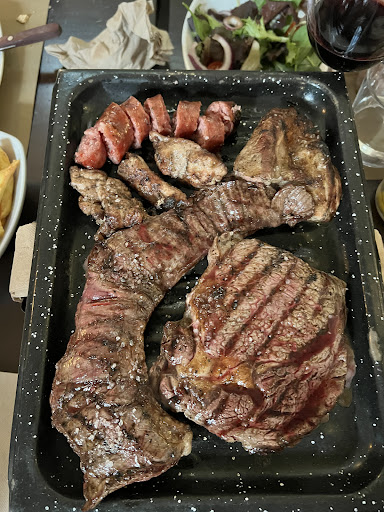 Read moreEl lugar no cumple como parrilla argentina, es más, las personas que trabajaban ese día no eran argentinos y eso ya hace dudar del producto que se sirve. Porque para servir una comida así de identitaria de un país, tenés que tener gente detrás que conozca de su gastronomia. No de personas que se quieren subir a la moda de tener una parrilla y te sirven según lo que leyeron en un libro. La parrilla escasa para el precio que cobran, 70% cerdo y el cerdo casi no se sirve en parrillas argentinas. Parece que, según la empresa, pagar una parrilla para dos y recibir dos pedazos de carne de vaca es culpa de la clientela por no pagar más. Se nota una vez más que de Argentina este lugar tiene lo que yo de Turquía. El pollo estaba muy bueno (lo más rico, lo cual ya dice mucho para ser un asador) la entraña insulsa, me hizo pensar que no era carne argentina y por la respuesta del local está clarísimo que no lo es. Un asador de comida argentina sin carne de alli. Claro, muy logico. La tira era rica, pero las mollejas eran tan ínfimas en porción que no puedo opinar casi. Parrilla para dos y ponen 3 mollejas, en serio? Les salía muy caro poner 4. La morcilla definitivamente no era argentina, el gusto era distinto y no me gustó para nada. El chorizo es olvidable. Yo que soy del país del cual este resto se apropia su gastronomia sin conocerla, responde que no sé cómo es un chorizo puro cerdo. Por favor, que ridiculos. Pedí una copa de vino y pregunté que variedades tenían y no me supieron contestar. Gastamos 54 euros por una experiencia medio pelo. Precio-calidad no...