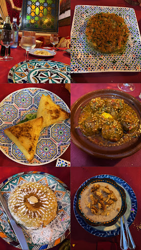 El menú que suelo pedir cuesta 25€/persona y consta de varios platos al centro para compartir: -Entrantes- Paté de berenjenas y hummus caseros, servidos con pan casero marroquí (suele estar templado así que presumo que está recién hecho o recién tostado) y aceitunas negras maceradas -ensalada- de variedades de lechuga con una vinagreta de nata, albahaca y piñones muy fresca y sabrosa. En ocasiones la sirven con granada o con pan tostado. -fidaws- uno de mis platos preferidos compuesto de fideos, pollo troceado, canela y frutos secos. El olor es el mismo que desprende un polvorón por eso el sabor salado sorprende. La textura es muy agradable. -cuscús de verduras. Sabroso, muy bien cocinado. -pastela- deliciosa combinación de un hojaldre salado y crujiente que envuelve al pollo en salsa troceado con un toque dulce en el exterior. -tajine- jugoso guiso de ternera, orejones, ciruelas y frutos secos servido en la pieza de barro tradicional -postre- dulces típicos marroquíes de almendra, mazapán, frutos secos, etc. -té verde escanciado por el camarero, servido en tetera típica en dos vasos con hojas de menta en su interior.