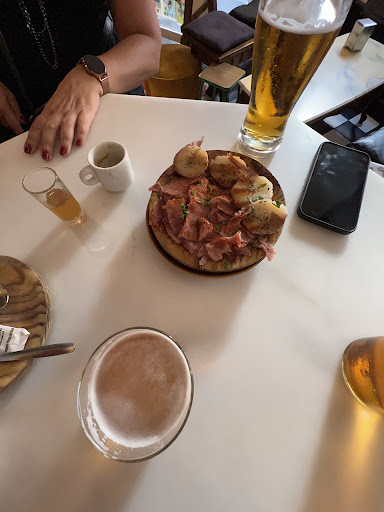 Vermouth & tapas, including vegan options, in a cozy environment with outdoor tables.