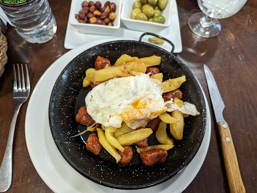 El pequeño recinto de este establecimiento no permite albergar a muchos comensales. En un local de cierta antigüedad, cuyo regente ha heredado hasta el nombre del anterior propietario, se conservan objetos vintage; esos que ya solo podemos encontrar en algún museo de artes y costumbres populares o en la casa de la abuela. Amontonados en repisas o estantes; podemos ver sin arte ni concierto; revueltos entre libros, botellas y otros objetos inservibles: aparatos de radio de los años treinta, cajas registradoras antiguas, máquinas de coser, aspas de viejos ventiladores… y todo, echando en falta la ausencia del plumero o de la bayeta; cubierto de polvo y telarañas, causando la sensación de que se encontraran en un desván o cuarto trastero. Llama la atención una máquina a modo de depósito o bomba de presión anclada en la pared, que en su día sirvió para producir agua con gas y que, según comentó la camarera, se sigue utilizando en la actualidad. Más información en mi...