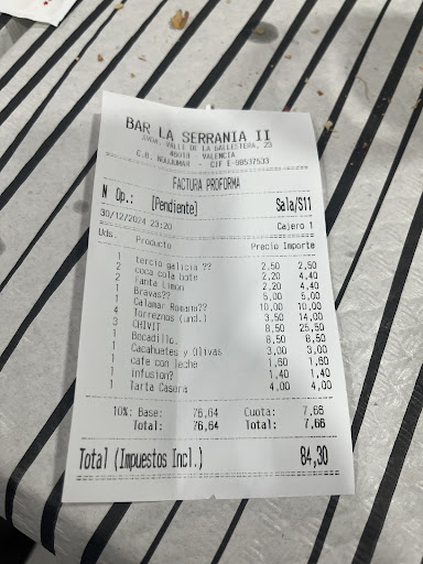 Read moreUn desastre de Bar, el servicio un descontrol, llegamos al bar Serrania II, decimos a la camarera que venimos a cenar y nos dice que la cocinera tarda 10 minutos vale, nos sentamos pedimos la bebida y pasados unos 30 minutos, preguntamos a la camarera que pasa con la cocinera, llama por teléfono y nos indica que al final no viene, bueno nos sorprendemos, y vemos en internet que tienen otro bar que se llama Serranía, está a 10 minutos andando, vamos hasta allí y bueno que comience el desastre de camareros, entre ellos se notaba el mal rollo entre compañeros pero bueno, ninguno se estera de nada tardan infinidad en atender, la comida regular un pelin cara y nuestro sorpresa 3€ por cacaos y olivas y no es eso lo gordo, los torreznos en la carta marcan 3€ y luego cobran 3.5€, tarta casera en la carta pone 3,5€ y luego te cobran 4€, en fin se les ha pasado actualizar y un bocadillo a 8.5€ no es caro es carísimo porque no es nada del otro mundo pan estilo chicle! Ehh en qué bar de Valencia te cobran eso…