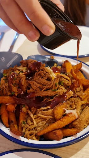 Como entrante pedí: 🍟PULLED PORK SWEET POTATO FRIES🥔 Patatas fritas de boniato con deshilachado de cerdo, queso Manchego y salsa Texas BBQ. (11€)