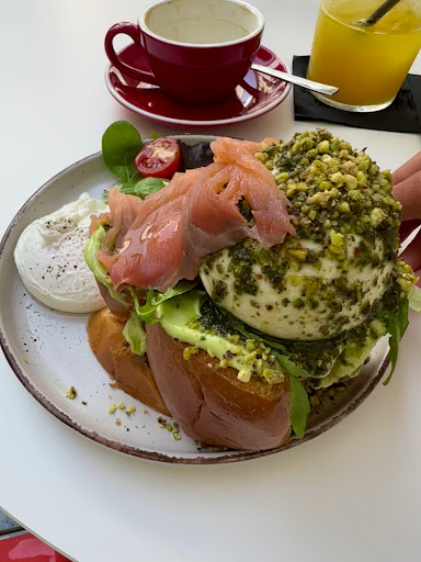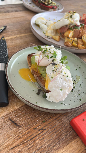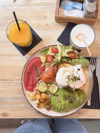 Good cappuccino & cortado, fresh OJ, tostada with aguacate with salmon. If you are hungry, order their specialty: A brioche tower comprosed of poached egg, smoked salmon strips avocado crème fraiche and a burrata on top sprinkled with herbs, on a bed of salad. All masterfully combined with fresh, simple ingredients in a happy outdoor ambience. Do not forget to try the lemon tart if they have it....