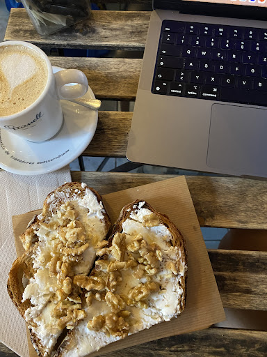 Pros: The menu was unique for us—not too many options, but just enough, which is a good thing. I chose the dish with hummus and tomatoes, and it was very delicious. I liked the vibe inside; it’s full of art and cozy. The staff was very friendly. It's a good place to bring your computer and work; there were a few people doing that. The prices are reasonable considering the quality of the service and food.