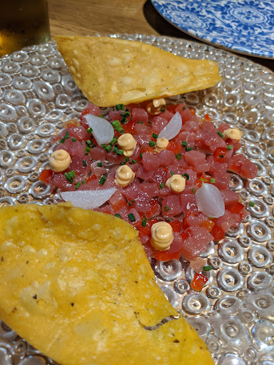 El tercer entrante fue el Tartar de Atún con Mayonesa de Chilis Torrados y Cacahuete Cítrico. Si bien es cierto que la cantidad para tres es algo escasa, la realidad es que el cambio de concepto en el tartar es algo a valorar. Sobre todo me gustó mucho la mayonesa de chiles torrados que estaba increíble. Aunque me decepcionó un poco porque mis expectativas eran bastante altas, la realidad es que si vais tenéis que probarlo y de ahí su...