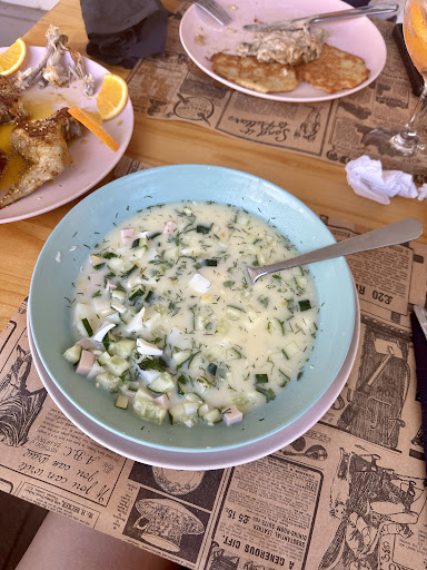Probé el borsch, una sopa clásica ucraniana, y me sorprendió su sabor profundo y equilibrado. También pedí okroshka, una sopa fría que nunca había probado antes: refrescante, ligera y perfecta para los días cálidos. Aunque no llegué a probar otros platos, la calidad y presentación de lo que vi en otras mesas también era excelente.